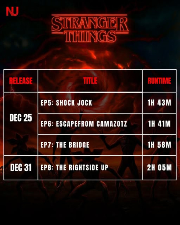 Кулминацията на историята, базирана в малкото измислено американско градче Хокинс през 80-те години, в което се случват свръхестествени и фантастични събития, ще настъпи с епичен двучасов финален епизод на 31 декември.